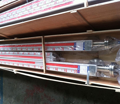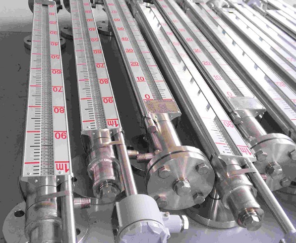 液位計根據(jù)浮力原理,浮子在測量管內隨液位的升降而上下移動,浮子內的永久磁鋼通過磁耦合作用,驅動紅、白色翻柱翻轉180’液位上升時,翻柱由白色轉為紅色,下降時,翻柱由紅色轉為白色,從而實現(xiàn)液位的指示。