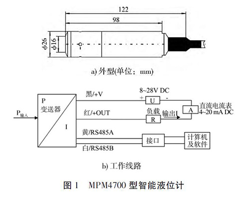 頂裝型磁翻板液位計(jì)以微處理器為核心單元,具有檢測(cè)、判斷和信息處理功能。其測(cè)量水位的基本原理是利用半導(dǎo)體硅材料的壓阻效應(yīng),實(shí)現(xiàn)液位壓力與電信號(hào)的轉(zhuǎn)換[2]。即把與液體深度成正比的液體靜壓力,通過(guò)液位計(jì)( 變送器) 轉(zhuǎn)換成電流信號(hào)輸出,從而建立輸出電信號(hào)與液體深度的線性對(duì)應(yīng)關(guān)系,實(shí)現(xiàn)對(duì)液位( 水位) 的測(cè)量。沉箱水位監(jiān)測(cè)選用MPM4700 型頂裝型磁翻板液位計(jì),該液位計(jì)以擴(kuò)散硅壓阻式傳感器為管芯,集成變換器電路、微處理芯片為一體,其性能穩(wěn)定,結(jié)構(gòu)緊湊,外圍線路簡(jiǎn)單。該液位計(jì)為四線制,可同時(shí)輸出一組4 ~ 20 mA 的標(biāo)準(zhǔn)電流信號(hào)和RS486 數(shù)字信號(hào)。MPM4700 型智能