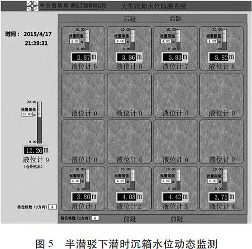 漳州后石港區(qū)3 號(hào)泊位碼頭工程采用重力式沉箱結(jié)構(gòu),該工程沉箱共15 件,單件質(zhì)量4 365 t,沉箱長(zhǎng)、寬、高分別為19. 8、21. 9 、25. 0 m; 沉箱分7 層澆筑,澆筑*頂層時(shí)3# 格倉(cāng)按設(shè)計(jì)圖紙預(yù)留3 m 高的缺口。在漳州預(yù)制廠預(yù)制,沉箱安裝施工現(xiàn)場(chǎng)距離預(yù)制廠約6. 3 km。沉箱采用氣囊橫移至出運(yùn)通道,再縱移至出運(yùn)碼頭前沿線上駁,采用8 000 t 半潛駁下潛安裝。根據(jù)浮游穩(wěn)定計(jì)算,沉箱各格倉(cāng)壓載水見圖4。2#、6# 格倉(cāng)為3. 98 m,3#、7#格倉(cāng)為4. 34 m,其余格倉(cāng)為3. 80 m,沉箱倉(cāng)外吃水12. 15 m。根據(jù)當(dāng)?shù)厮恼境毕恚?015-04-17T20∶30 下潛坑潮位條件符合下潛要求,半潛駁在下潛區(qū)開始加水下潛; 下潛至沉箱吃水1. 8 m 時(shí),同時(shí)開啟沉箱的8 個(gè)注水閥門開始向沉箱格倉(cāng)中注入壓載水; 當(dāng)沉箱吃水5 m 時(shí)半潛駁暫停下潛,起重船靠近半潛駁,工人將連接起重船吊鉤的鋼絲繩用卡環(huán)固定在沉箱頂部吊環(huán)上。半潛駁繼續(xù)下潛至9 m 時(shí)再暫停下潛,等待吊纜就位。半潛駁繼續(xù)下潛,在沉箱底與枕木支墊處于脫離的臨界狀態(tài)時(shí),減緩半潛駁下潛速度,直至沉箱完全脫離浮船塢。此時(shí)啟動(dòng)吊機(jī),使鋼絲繩處于輕微受力狀態(tài)。在半潛駁下潛及沉箱格倉(cāng)注入壓載水過(guò)程中,通過(guò)大型沉箱水位監(jiān)測(cè)系統(tǒng)能夠動(dòng)態(tài)顯示各格倉(cāng)水位值及沉箱的吃水深度( 圖5)