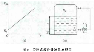 差壓法檢測液位,是將差壓變送器的高壓室(+)接口與HO液層面相連通,低壓室接口(-)與罐頂氣體空間相連通。通過高低壓室膜盒產生形變的程度與“+”、“-”壓室之間的壓力差值(即△P=P+-P-)測得差壓。由式(1)和(2)可知:
