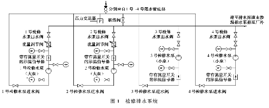 每臺(tái)檢修水泵均配置逆止閥、壓力表和帶流量開關(guān)的示流信號器,在1號、2號水泵出水管處各安裝了一個(gè)流量調(diào)節(jié)閥。系統(tǒng)中共有2根總管,一根為水泵的總吸水管,包括從每臺(tái)機(jī)組尾水管底部至總管的支管,總吸水管和部分支管及管路上的操作閥門布置在廠房管路廊道中;另一根為總排水管,可將水排至滲漏集水井中,再經(jīng)滲漏排水泵排至下庫。