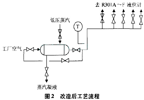 此次試驗(yàn)的成功為徹底解決乙烯球罐磁翻板結(jié)冰提供了寶貴的經(jīng)驗(yàn),因此將試驗(yàn)期間所用的臨時(shí)管線和設(shè)備經(jīng)過進(jìn)一步完善,于2016年4月底完成全部乙烯球罐(R301A-F)耐酸堿磁翻板液位計(jì)的改造,液位計(jì)上的空氣吹掃管為自制設(shè)備,進(jìn)氣端裝一閥門用于調(diào)節(jié)空氣量,另一端封閉,在靠進(jìn)液位計(jì)翻板側(cè)每間斷開5cm一個(gè)中的孔用于空氣吹掃為保證吹掃空氣的溫度在加熱器出入口增加一旁線,流程見圖2。