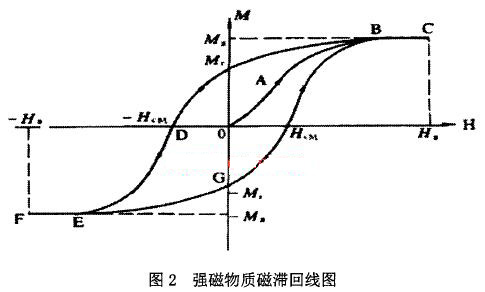 磁開關內部裝有鐵質的彈性簧片,在低頻磁場中,鐵質簧片被磁化,從而使彈性簧片吸合導通,而油位計內部磁翻板未達到磁開關動作值的位置,所以監控誤報油位異常信號。當機組停機時,勵磁電纜中電流消失,但此時磁開關誤動作信號并未復歸,下面將通過磁滯回線的概念來解釋此現象。