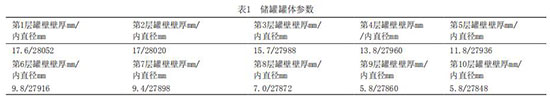 (1)改造前對儲罐的罐體進行了超聲波測厚以及材料的化學成分及性能分析,其材質滿足現行的使用條件,其儲罐的罐體參數及每層罐壁的厚度(實測)見表1,罐壁的每層壁板高度為1690mm,其搭接寬度為40mm,縱焊縫為對接結構,見表1。