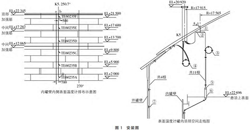 以昆侖能源華油天然氣四川廣安液化天然氣2萬方儲罐為例,在安裝多點溫度計過程中,內罐底部溫度熱電阻需要從內罐浮頂進入罐內,沿罐壁垂直向下固定在罐底部。如需夾層底部溫度測量,則需要將溫度熱電阻沿外罐壁垂直而下,固定在罐底夾層的氮氣管上,每間隔4m布置1個電纜固線器,如圖1所示。