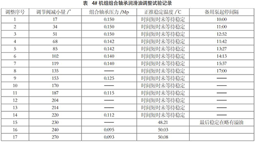 (4)方案四:調整組合軸承潤滑油量經過主機制造廠設計部計算復核,認為現有油泵有可能滿足冷卻要求。經過與電廠溝通,聯合制定了減少組合軸承用油量的試驗方案。主要措施為:在組合軸承供油管調節閥后組合軸承前增加一壓力表,用于監視組合軸承供油壓力。機組在滿負荷運行條件下,分階段逐步調整節流閥減少供油量,監視記錄組合軸承供油壓力和組合軸承溫度,直到單臺油泵滿足用油量略有余量、備用泵處于備用狀態下,正向推力瓦*高溫度控制 55℃以內。*后恢復單冷卻器運行和環境溫度*高條件下檢驗軸承溫度。