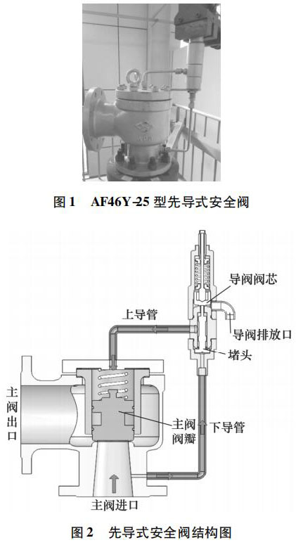 立式儲罐液位計常見的故障包括: 主閥導閥泄漏、導閥超壓不動作、主閥未隨導閥動作。主閥導閥泄漏失效原因: 密封面臟污或損傷,零部件卡阻、密封墊圈老化變形; 導閥超壓不動作失效原因: 導閥密封面銹蝕粘合或材料變形、導閥彈簧過緊或卡阻、導閥下導管堵塞; 主閥未隨導閥動作失效原因: 主閥運動卡阻、導閥排氣量過小。然而,安全閥起跳不回座故障在試驗過程及工業現場也是非常常見的,國內對于立式儲罐液位計起跳不回座失效分析的相關研究較少。本研究以某公司生產的 AF46Y-25 型立式儲罐液位計為研究對象,研究導閥結構并分析其動作過程。在對其開展動作性能試驗時,發現該安全閥實際回座壓力遠低于標準要求,排放時間過長,回座失效。因此,對其進行受力分析,以探討回座失效的原因。