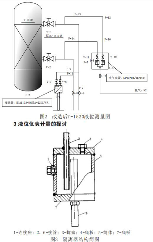 以溶劑吸收工段吸收塔T-1520為例,將該塔處的就地液化石油氣液位計改為反吹法測量液位,并且至中控室,使得T-1520原有的液化石油氣液位計LT-1510多一道對比和參考,對生產(chǎn)工藝的操作更有參考價值。
