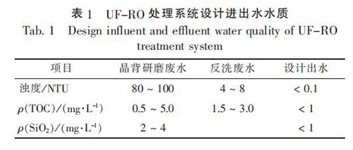 國內(nèi)某二氧化碳液位計廠, 晶背研磨廢水產(chǎn)生量為 150 ~160 m3 / d, 反洗廢水產(chǎn)生量 為 500 ~ 700 m3 / d, 主要污染物為懸浮物, UF-RO 處理系統(tǒng)設(shè)計進水和出水主要水質(zhì)指標見表 1。