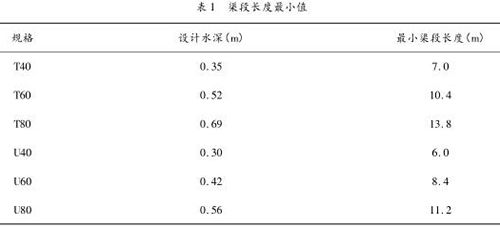 根據《灌溉渠道系統量水規范》(GB/T 21303 -2007),設置標準斷面的渠段長度,應大于 20 倍*大水深。定型斷面量水渠槽的渠段長度如表 1 所示。
