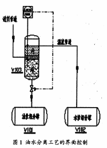 從圖中可以看出,這是一個連續化的生產過程。進料管中的介質是氯乙酸甲酯、水與甲醇的混合物,物料連續地從分離罐V103的中部進料口流入罐內,在罐內自然分層。上層的物料是水與甲醇組成的水性組分,下層的物料是以氯乙酸甲酯為主的油性組分,中間為混合層,工藝的要求是水性組分必須從溢流管道流出進入V102儲罐;油性組分必須通過液位調節閥LV103進入V101儲罐;同時為了防止物料過多,從分離罐頂部溢出,還需設置罐內高液位時的報警。