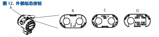使用位于頂部銘*下、三組可能的外部組態按鈕中某一組進行零點調校。為了操作組態按鈕,需要松開螺釘,滑動變送器頂部的銘*。參照圖 10 來確認功能。