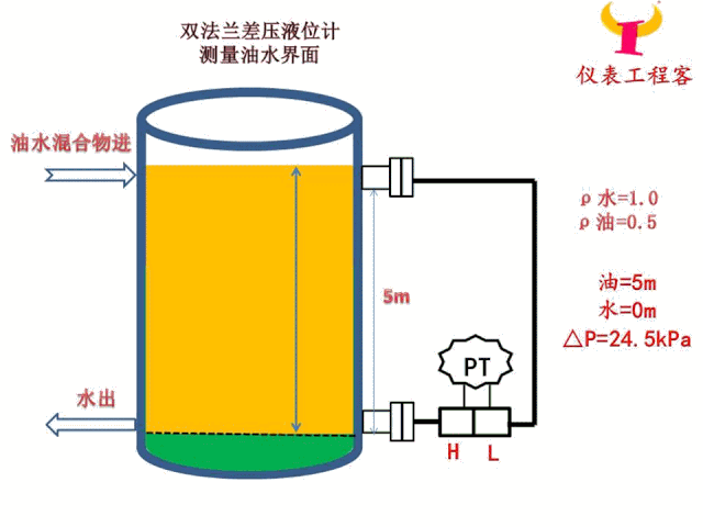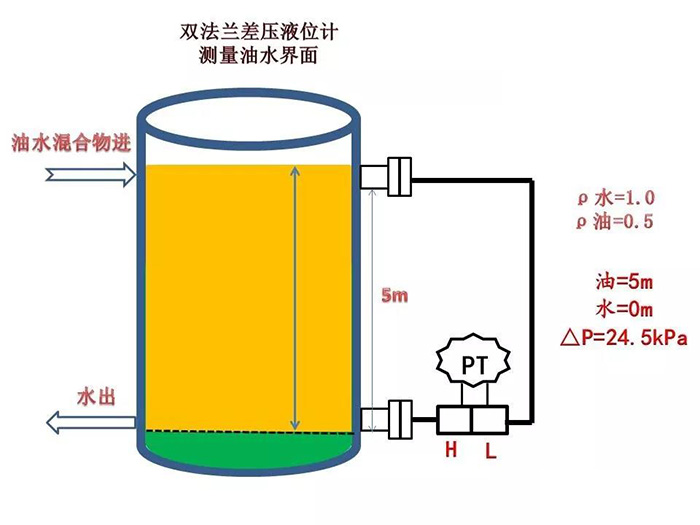 水的密度為1.0,油的密度為0.5,變送器的硅油密度為0.93,測量范圍5m,求油面在5m時(shí)變送器的差壓值。