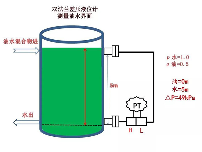 水的密度為1.0,油的密度為0.5,變送器的硅油密度為0.93,測量范圍5m,求水面在5m時(shí)變送器的差壓值。