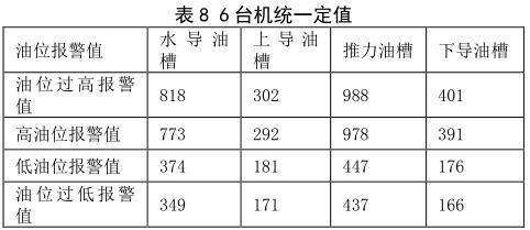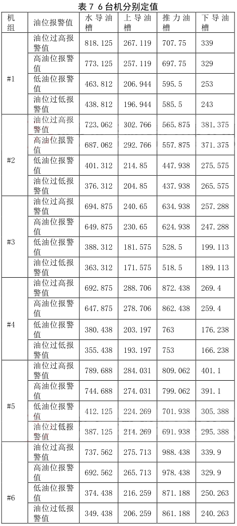(2)依據(jù)成都勘測設計院給的定值要求,建議每臺機設置不同的報警值。設置原則:在上導、下導、推力各部油槽油位,結合機組運行時的油位*大值上設置高油位報警值+20mm、過高油位報警值 +30mm;*低油位值上低油位報警值 -20mm、低油位停機值 -30mm;水導油槽油位:高油位報警值 +45mm、過高油位報警值 +90mm;*低油位值上低油位報警值 -130mm、低油位停機值 -155mm;躲過報警值。在此基礎上,真實的油位只會下降,設置值對油位的運行是安全的。分析確定的#1-#6 機組各油槽油位的動態(tài)油位報警值,即機組運行時油槽油位的過低、低、高、過高報警定值如下,可以選擇表 9 的數(shù)據(jù) 6 臺機分別進行定值,同時也提供定值表 10 進行 6 臺機統(tǒng)一進行定值。