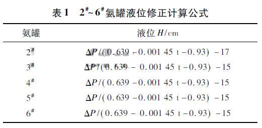 因液氨密度受溫度影響大,且每個氨罐的保溫效果也有差異,故如需準確測量氨罐液位,必須引入溫度測量。對2#~6#氨罐分別進行卸壓,并引入熱電偶遠傳至DCS系統,對密度進行修正,修正公式為Q液=0.639-0.00145t。經過以上修正,2#~6#氨罐液位修正計算公式