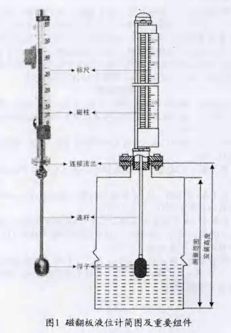 側裝磁翻板液位計是根據國內外同類產品加以消化提高且按照原化工部頒布的磁浮子液位計標準HG/T21584-95研制生產的產品。按照其安裝位置,側裝磁翻板液位計可以分為頂裝型和側裝型兩類。目前,托甫臺區塊密閉流程采用的是無護管頂裝型液位計(U11Z221/D-2400),23口單井密閉流程中共一計使用87個。側裝磁翻板液位計主要利用阿基米德浮力原理和磁耦合原理設計而成,它的主要組成部分包括磁浮子、連桿、磁性頭、磁柱以及面板標尺等(圖1),磁柱正反兩面分別為紅色和白色,主要用于指示液面位置。液位計正常工作時,磁浮子一半體積浸沒在液體中,呈漂浮狀態,并且隨著液面的升降而同時升降。當液面上升時,磁浮子帶動連桿上的磁性頭向上運動,磁性頭與面板內的磁柱發生物理反應,產生扭矩,促使磁柱發生180°的翻轉,即由白色轉變為紅色;當液面下降時,根據相同的原理,磁柱由紅色翻轉為白色。因此,顯示面板上磁柱紅色和白色的分界線就指示了容器內待測液體的液面位置。
