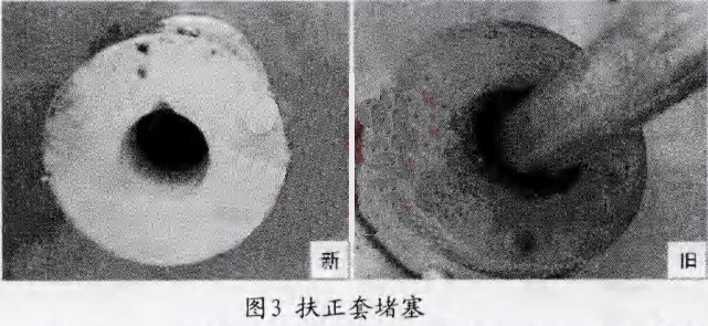 扶正套的材料為塑料,在連桿的上下反復運動過程中,易將砂粒及稠油帶至扶正套處,造成孔眼堵塞(圖3),進而阻礙了連桿的上下活動,導致液位計無法根據現場實際液位變化瞬時復原,形成假液位,測量不準確。